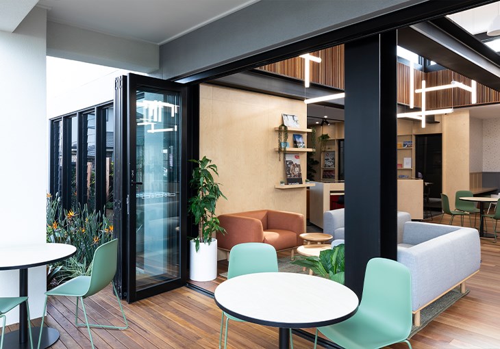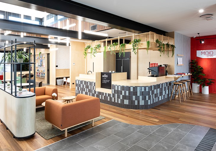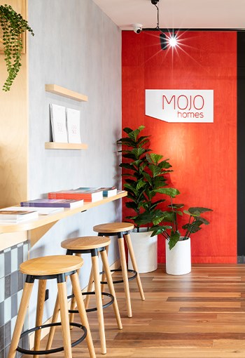 Mojo Homes Inspiration Centre for customers looking to purchase house and land packages through Mojo Homes. The design of the space allows customers to explore and research the home and purchase options through, face to face home consultants, physical and digital information points. The inspiration centre has café and seating areas, video presentation areas, semi private and private sales offices, kids play, external garden and a granny flat showcasing the interior design styling options for new homes. The new interior concept is carefully planned with the customer journey and path to purchase in mind. The interior design is created within a residential Mojo home building and the various interior finishes and materials have collaborated and work with the varying supplier relationships that Mojo Homes has established in the market place.